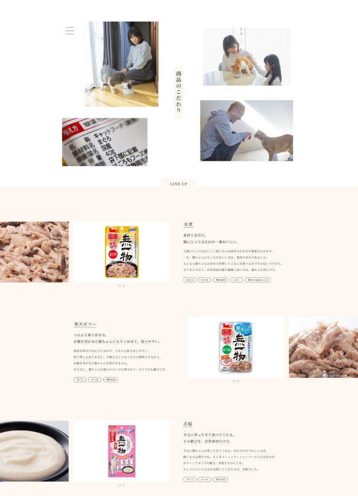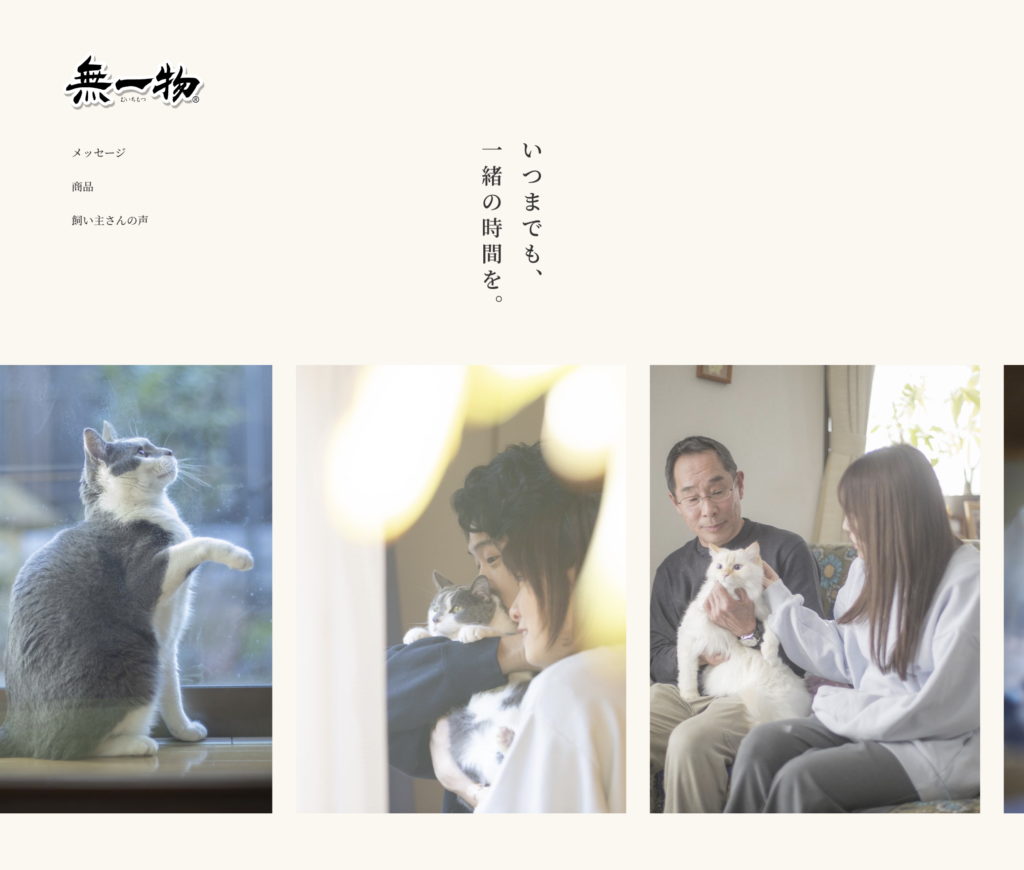 はごろもフーズのキャットフード、無一物(むいちもつ)の新キャンペーン。シーチキンと同じ製法に則って鮮度を大切につくられるごはんは、例えば「まぐろ」の裏面にある原材料名は「まぐろ」だけ、という自然の美味しさ。新たにスティックタイプの舌福(ぜっぷく)が加わったことを機にブランド全体をリニューアルをスタートしました。